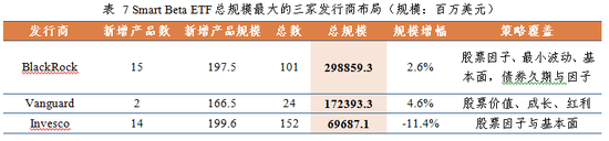 Vanguard依靠布局价值与成长Smart Beta ETF,尽管总产品数目较少,但总规模排在所有发行商第二,平均产品规模位列第一。全部Smart Beta ETF在2018年的平均费率为0.52%(最高费率为1.4%),但Vanguard的平均费率仅为0.14%,在全部发行商中接近最低。此外,BlackRock综合实力优势凸显,在新增产品、总体规模、发行总数同时表现强劲,领跑地位愈加巩固。