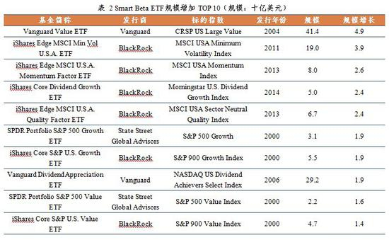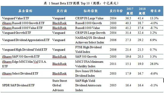 成长价值领衔规模前十大,老牌发行商依旧占据核心位置。截至2018年末,规模最大的Smart Beta ETF为Vanguard于2004年发行的Vanguard Value ETF,总规模414.08亿美元,规模排名前四的全部为价值成长策略ETF。除此之外,规模排名前十的Smart Beta ETF全部被Vanguard,BlackRock,SSGA所占据。