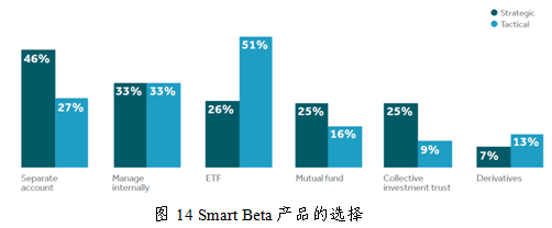 对于不同配置方式,机构选择的Smart Beta产品类型有所差异,对于战略性配置,专户、内部资产管理与ETF是首选的三种产品,而对于战术型配置,ETF则是首选工具。
