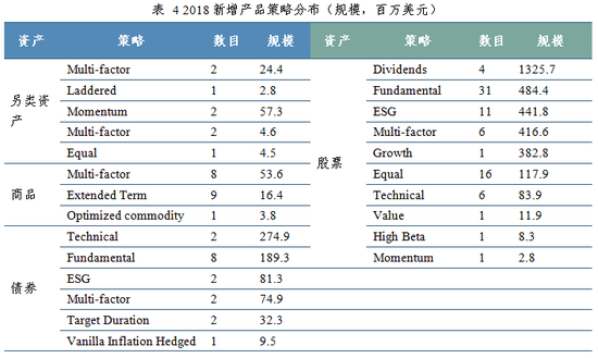 2018年新增股票类Smart Beta ETF中规模最大的是红利策略的产品,数量发行最多的是基本面产品。此外,ESG,多因子,等权也是去年新增产品中涉及较多的策略。