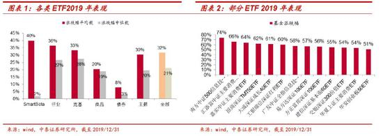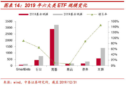 1、市场回顾:2019年是中国ETF爆发的一年,97%的ETF录得正收益,13只涨幅超50%,基金规模同比上涨59%达5991亿元,七成增量来自新发基金。