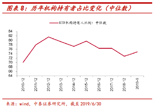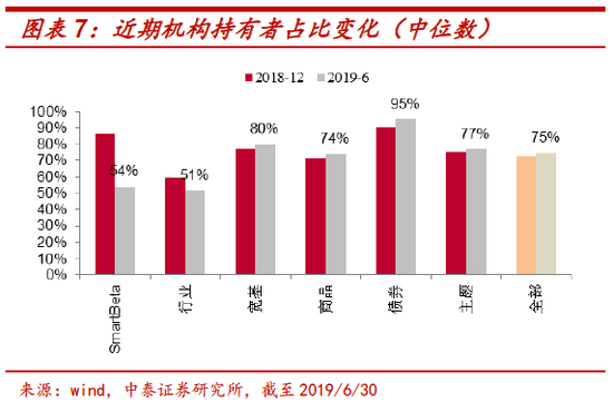 从ETF持有人来看,机构投资者仍然占主流,目前机构持有占比较多的ETF类型依次是:债券ETF、宽基ETF和主题ETF,持有占比中位数分别为95%,80%和77%。