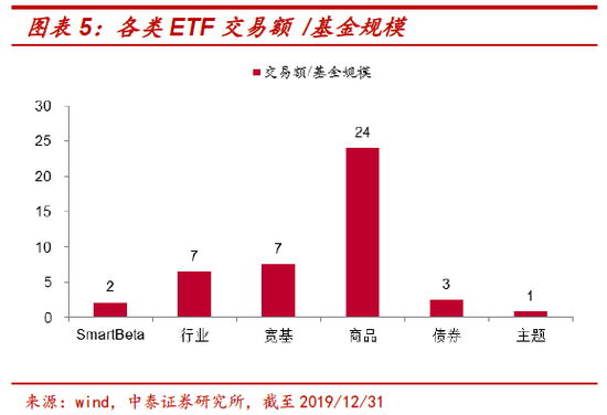 在交投最活跃的前10中,有8席为宽基指数,华夏上证50ETF作为上证50期权对应标的,交易额比第二名南方中证500ETF多出1600亿,是当之无愧的“流动性之王”。如果剔除规模因素,商品类ETF的单位规模的交易金额最高,其中仅华安黄金ETF一只就贡献了商品类ETF交易额的61%,也跻身10大交投活跃ETF名单。而国泰基金的证券ETF是行业类ETF中的交投活跃代表。