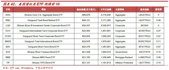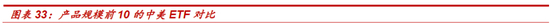 比较中国和美国规模前10的产品后发现,国内规模top10 ETF的同质性高,多为宽基类ETF,其中仅沪深300ETF就占了3席。规模排在前10名的产品,类型更加丰富,除了本土宽基类ETF外,还有跨境ETF和债券型ETF。
