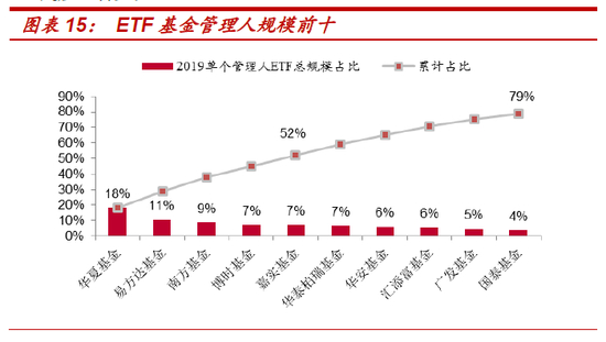 从全市场ETF来看,前5名基金公司的ETF总规模占比达到全市场的52%,前10名基金公司占比为79%——前20%的基金公司占据了80%的份额, “二八效应”明显。