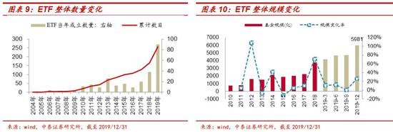 截至2019年12月31日,共256只ETF成立,规模达到5991亿元,较去年同期规模上涨59%,其中4季度规模扩张速度加快,单季规模上涨27%。