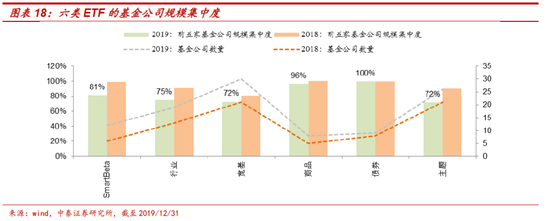 在每种ETF类型下,按基金管理人旗下的产品总规模进行排名,并计算基金管理人的规模集中度。从六大类ETF来看,前5的基金公司总规模占比较2018年小幅下滑,不过仍在70%以上,与此同时,各类ETF的参与基金公司数量均有上升——说明后来竞争者的加入,稀释了头部基金管理人的一部分份额。
