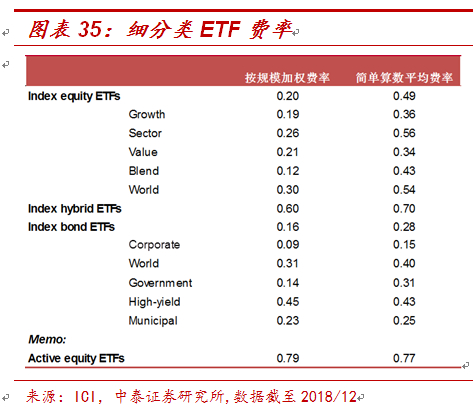 美国权益类ETF的平均费率为0.5%,但规模加权费率为0.2%,说明很多巨型ETF将费率压得非常低。