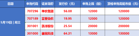 5月19日周三A股有4只新股申购,分别为:神农集团(申购代码:707296)、富春染织(申购代码:707189)、凯淳股份(申购代码:301001)、肇民科技(申购代码:301000)。
