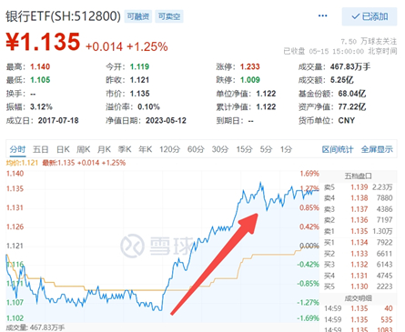昨日午后,以银行、券商为代表的大金融行情卷土重来,截至收盘,建设银行、工商银行强势翻红收涨逾1%,邮储银行涨超3%,板块代表ETF——银行ETF(512800)收涨1.25%,全天振幅超3%。