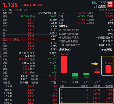 “中特估”行情方兴未艾,资金借道ETF积极布局。Wind数据显示,银行ETF(512800)最新单日(5.15)获资金净申购1.77亿元,近10日资金累计净申购8.34亿元,足见资金就银行板块后市表现坚定看多。
