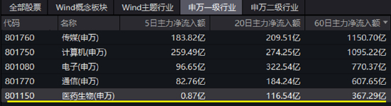 主力资金方面,Wind数据显示,截至今日收盘,医药生物行业(申万)近20日净流入逾116亿元,在31个申万一级行业中排名第7;近60日净流入逾367亿元,排名第5——前4名均为年初以来大热的AI概念相关行业。