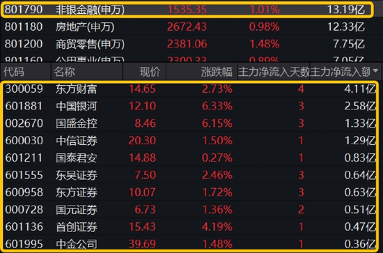 资金面上,申万一级非银金融板块今日获主力资金增仓13.19亿元,其中多只券商股获重点布局。其中东方财富获主力资金净流入4.11亿元,位居板块吸金榜首位,其次是中国银河、国盛金控、中信证券,分别获加仓2.58亿元、1.33亿元和1.29亿元。