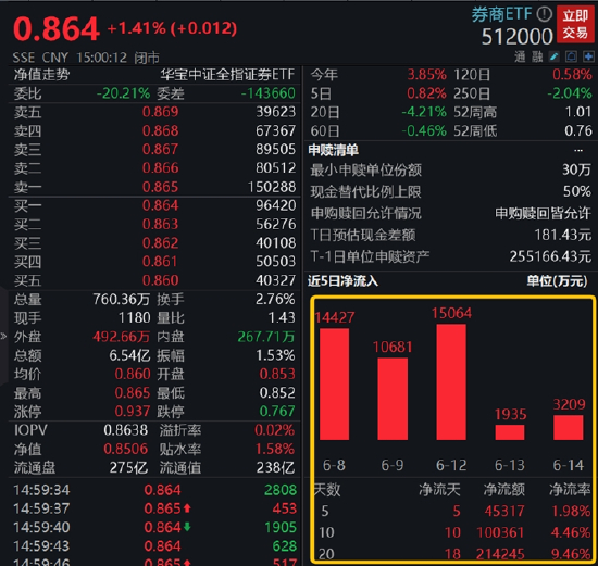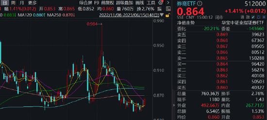 板块代表ETF方面,A股顶流券商ETF(512000)午后震荡攀升,场内价格收涨1.41%,一举将20日线收入囊中。全天成交额6.54亿元,较前一交易日放量30%。