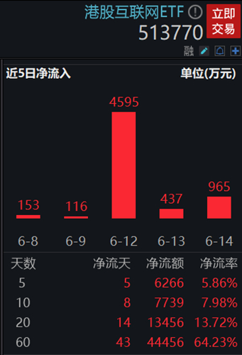 与日趋回暖的盘面相呼应的是,港股相关ETF资金面也是持续流入态势。上交所数据显示,港股互联网ETF(513770)昨日再获965万元资金净申购,自6月5日以来港股互联网ETF(513770)已连续8日净申购,区间累计吸金8423万元。从该ETF近20日、60日资金面数据看,近期港股吸引力大幅增加,不少资金借道相关ETF提前潜伏。