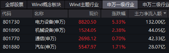 从主力资金流向来看,智能电动车产业相关的权重行业今日获主力资金大举挺进。第一大权重行业电力设备(申万一级)主力净流入132亿元一骑绝尘!第二大权重行业汽车主力净流入28亿元,位列全市场申万一级行业第4。
