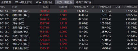 主力资金动向上,从申万一级行业来看,今日电力设备吸金力一马当先,单日获主力资金爆买132亿元;其次是机械设备和通信,分别获主力资金净流入44.05亿元、42.33亿元。净流出方面,今日主力资金重点减仓计算机、电子等板块,分别净流出30.81亿元、23.21亿元。