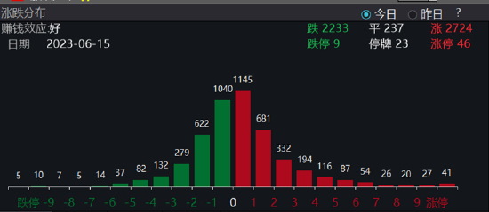 从个股表现来看,今日两市个股涨多跌少,2724只个股上涨,2233只下跌,237只持平,赚钱效应为好。