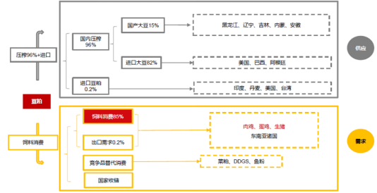 大家从图中可以看到,大部分的豆粕来源于国外进口+国内压榨,用途主要用于饲料消费。