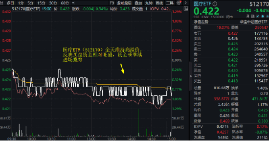 ETF方面,板块头部医疗ETF(512170)缩量下跌,截至收盘场内价格跌0.94%,全天成交3.43亿元。值得关注的是,医疗ETF(512170)场内全天交易溢价,午后价格跌幅扩大区间溢价进一步走阔,显示买盘较为强势,或有巨量资金逢跌揽筹。