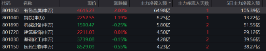 资金方面,今日有色金属主力净流入额64.98亿元,高居31个申万一级行业之首!钢铁、机械设备分列二三位,主力净买入额分别为8.25亿元、5.80亿元。计算机、电力设备、食品饮料流出额居前。