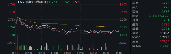 场内热门的港股互联网ETF(513770)早盘一度冲高翻红,后随着人民币汇率走低重回调整态势,尾盘场内价格收跌1.15%,日成交额1.60亿元。