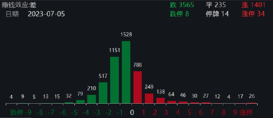 个股方面,两市总体跌多涨少,今日共计1401只个股上涨,3565只个股下跌,235只个股持平,赚钱效应由“好”转为“差”。