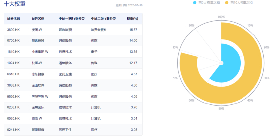 资料显示,港股互联网ETF(513770)跟踪中证港股通互联网指数,权重股汇聚腾讯控股、美团、小米集团、快手等不同互联网细分赛道龙头公司,其中持仓腾讯控股、美团、小米集团、快手、哔哩哔哩权重超60%,前十大成份股权重近80%,重手聚焦互联网巨头企业,顺应互联网头部效应的产业优势!