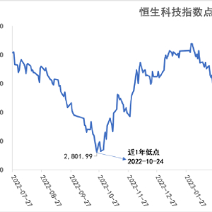近1年,恒生科技指数的低点出现在2022年10月24日,指数点位2801.99;