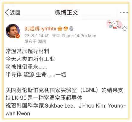 中国社会科学院教授、经济学家刘煜辉也激动得发博:“人类所有工业将被推倒重来,包括半导体、能源……”室温常压超导体的合成和复现,意味着什么?为什么影响这么大呢?