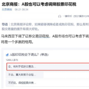 - 今年6月底,马来西亚下调股票交易印花税,北京商报社论提出“A股市场也可以考虑下调”。