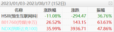 截至8月16日,代表港股互联网传媒龙头股走势的恒生互联网科技业指数年内下跌11%,远远落后于同期A股的申万传媒指数(26.52%)及美股的纳斯达克100(35.99%),在本轮AI行情中严重滞涨。