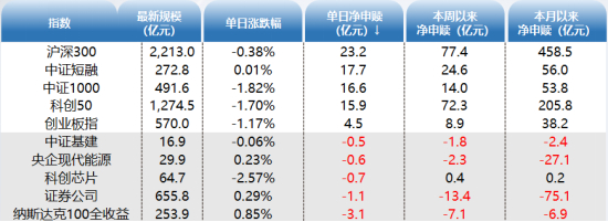 代表大盘蓝筹风格的沪深300持续吸金,单日净流入高达23.2亿元(上一日为14亿元),本月已累计净流入448.5亿元;债权指数中证短融、代表小盘风格的中证1000和高科技成长风格的科创50紧随其后,单日净流入分别为17.7亿、16.6亿和15.9亿元。 中证1000、科创50也是减持新规受益方向,未来控股股东高位套现的现象有望得到改善。