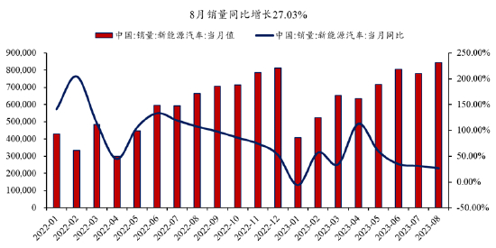 基本面上,就市场销量来看,新能源汽车销量稳步提升。8月新能源车总销量84.6万辆,同比上升27.03%,环比上升8.47%,其中纯电销量59.7万辆(同比+14.40%),插电销量24.9万辆(同比+72.82%)。