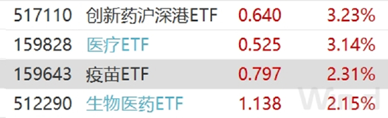 今日A股以及H股的医药股集体走强,相关行业ETF——创新药沪深港ETF(517110)收涨3.23%领涨市场。此外,医疗ETF(159828)涨幅也超3%,疫苗ETF(159643)、生物医药ETF(512290)等涨幅逾2%。