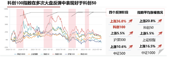 此外与科创板50相比较,科创板100在多次大盘反弹中都表现占优,呈现出“小身材,高预期,高弹性”的特征。科创板100历史表现优于科创50,基日截至2023年6月30日收益率分别为17.37%和0.51%。在多次科创板上涨行情中,弹性明显强于科创板50,平均超涨15%以上。科创板100汇集中小市值企业,未来业绩弹性一般较大。