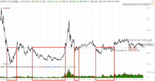 图表:2008年-2023年10月上证指数历次跌破3000点的走势