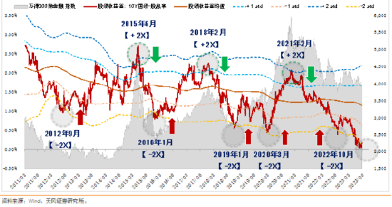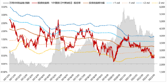 图表:A股股债收益差(债券利率为十年期中国国债)