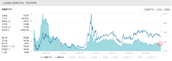 2008年首次跌破3000点时,上证指数的市盈率(PE-TTM)还是22多倍,现在已经下降到12倍,