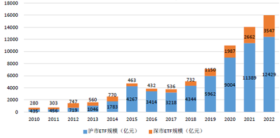 图:我国境内ETF市场资产规模变化情况;数据来源:上交所《ETF行业发展报告(2023)》,截至2022.12.31