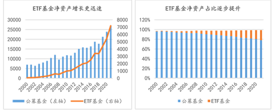 上海证券基金评价研究中心数据显示,从1993年全球第一只ETF成立到2009年ETF规模首次突破万亿美元,全球ETF市场经历了17年;而到第二个万亿美元,全球ETF市场仅用了4年时间;3年之后,全球ETF资产规模突破3万亿美元;而后1年便突破了4万亿美元;此后更是一年一个台阶,2019年规模突破6万亿美元,2020年规模突破7万亿美元,2021年突破10万亿美元。