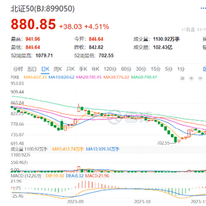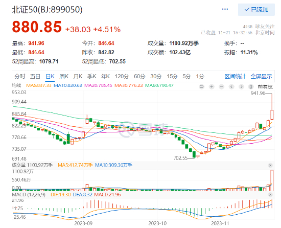 今日市场最热的莫过于北证50指数,午后一度狂飙超11%,强势突破900点大关,最高上探至941.96点,6只成分股涨超10%,底部以来反弹超25%!板块成交也急剧放大至102亿元,轰出了历史天量!飙涨之后午后持续回落,截至收盘涨幅4.51%。