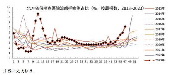 方正证券认为,面对流感叠加新冠、肺炎支原体感染等多种呼吸道疾病流行,感染预防、诊疗各环节需求有望加速释放,带来相关产业链投资机会。特别是国内目前流感疫苗接种率不足4%,市场渗透率较低,流感高发将有望带动疫苗行业发展。此外,呼吸道疾病的临床症状和体征虽然相似,但针对不同感染源的治疗方法有显著的差异,这对于病原体的检测识别带来了较大需求。