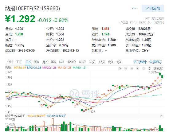 热门ETF方面,主打低费率的纳指100ETF(159660)今日平开收跌0.92%,收盘溢价依然高达0.37%。