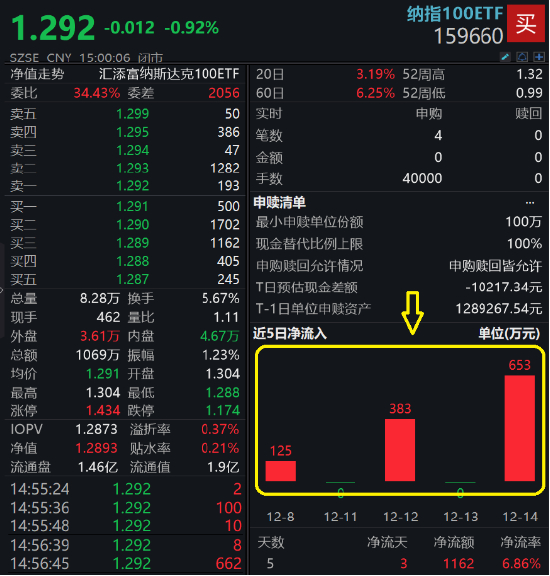 值得关注的是,低费率的纳指100ETF(159660)近期资金面回流明显,最近5日吸金近1200万元,尤其是显著溢价时,申购卖出套利成为很多投资者的增厚收益策略!