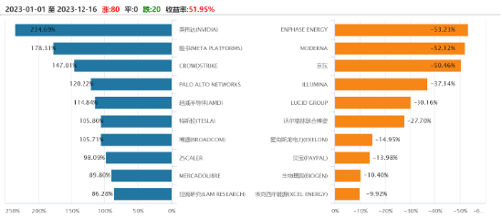 成份股表现看,该指数有80只成分股年内录得正涨幅,大型科技股表现尤为出色,英伟达涨近235%领跑,脸书、超威半导体、特斯拉、博通等知名科技股年内涨超100%。
