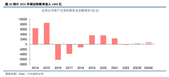 展望2024,预计2024年银证转账带来增量资金在1000亿左右。银证转账方面,至2023年6月,证券公司客户交易结算资金余额达19300亿元,较年初增加500亿元;结合下半年市场行情与开户数量,预计全年在500亿左右。假定2024年总体呈现修复性行情,考虑到未来机构投资者占比提升和基金投资习惯的形成,预计2024年银证转账带来增量资金1000亿左右。