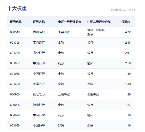数据显示,截至2024年1月2日,上证综合指数(000001)前十大权重股分别为贵州茅台(600519)、工商银行(601398)、农业银行(601288)、中国石油(601857)、中国银行(601988)、中国人寿(601628)、长江电力(600900)、招商银行(600036)、中国石化(600028)、中国神华(601088),前十大权重股合计占比20.93%。