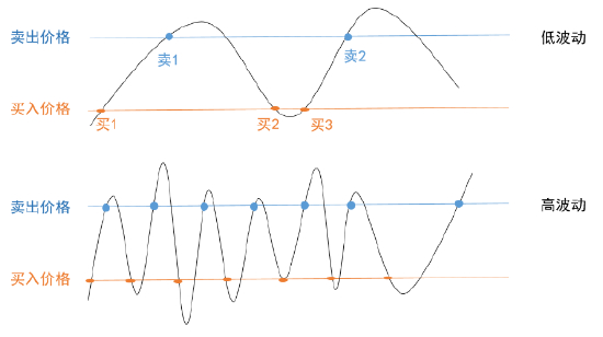 图表:低波动VS高波动,同一区间后者触及买入/卖出的次数更多、累计收益也会更多