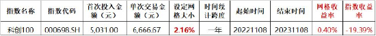 图注:本次回测区间为2022年11月8日-2023年11月7日,科创100ETF华夏的跟踪指数网格大小为2.16%回测全部资金为10万元,当上涨或下跌2.16%触发一次卖出/买入,每次回测假定交易成本为5块钱网格收益率=目前持仓所有市值/10万元,指数收益率的统计区间为2022年11月8日-2023年11月7日收益率以跟踪指数涨跌幅计算。区间年化收益率=(1+区间收益率)365/区间实际自然日天数)-1,科创100ETF华夏的跟踪指数网格收益率以及指数收益率年化分别是0.40%和-19.39%。此模拟为历史模拟收益率,模拟收益不代表历史的真实收益,也不代表未来的预期收益。